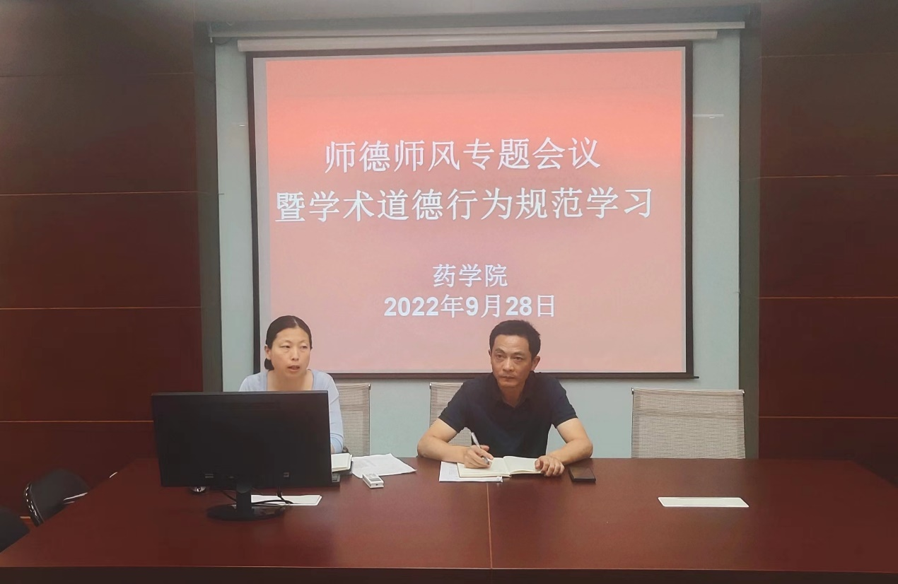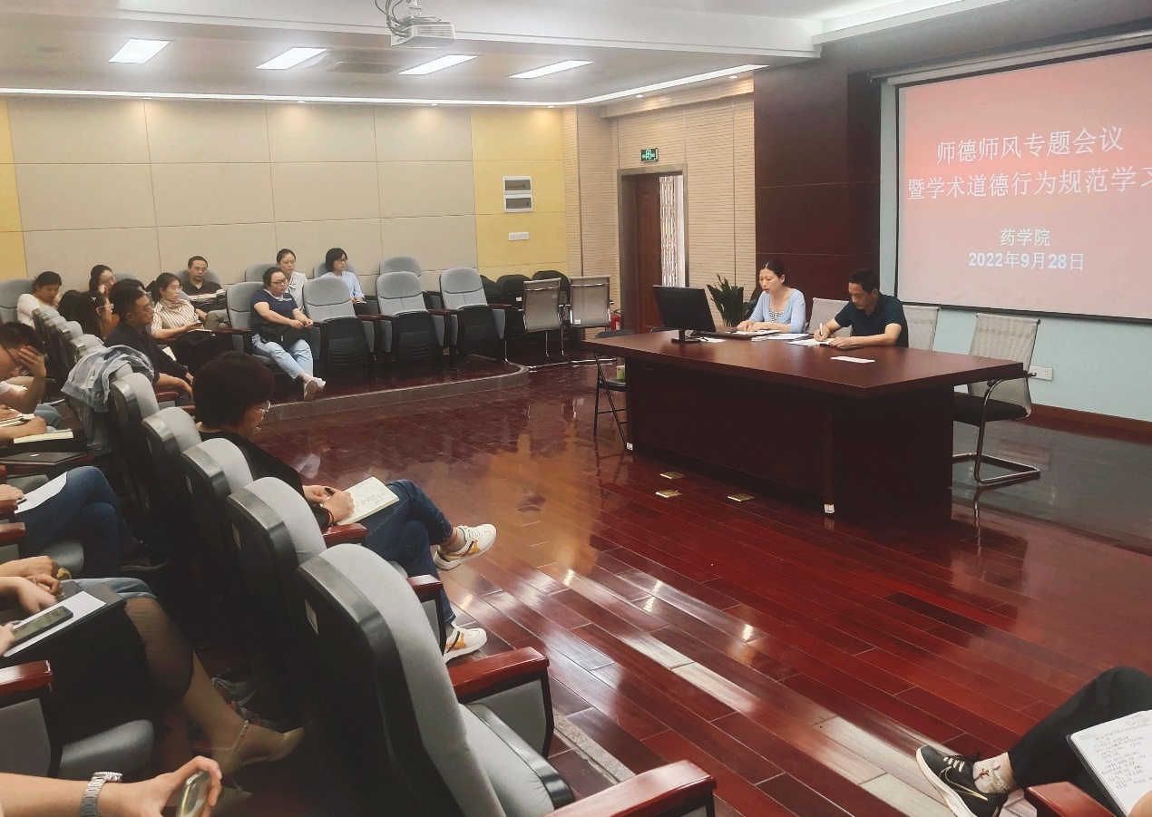为了加强药学院师德师风建设以及学术道德建设,严防学术不端等行为,积极引导广大教职工以德立学、以德施教,2022年9月28日,药学院全体教职工在药学院实训楼一楼会议室开展师德师风专题会议暨学术道德行为规范学习,药学院副院长杨莹主持会议。