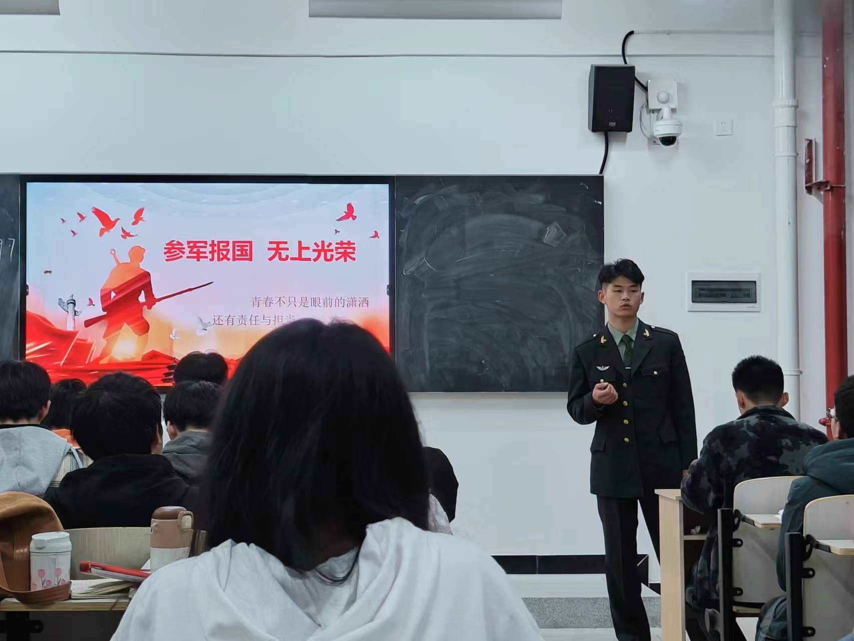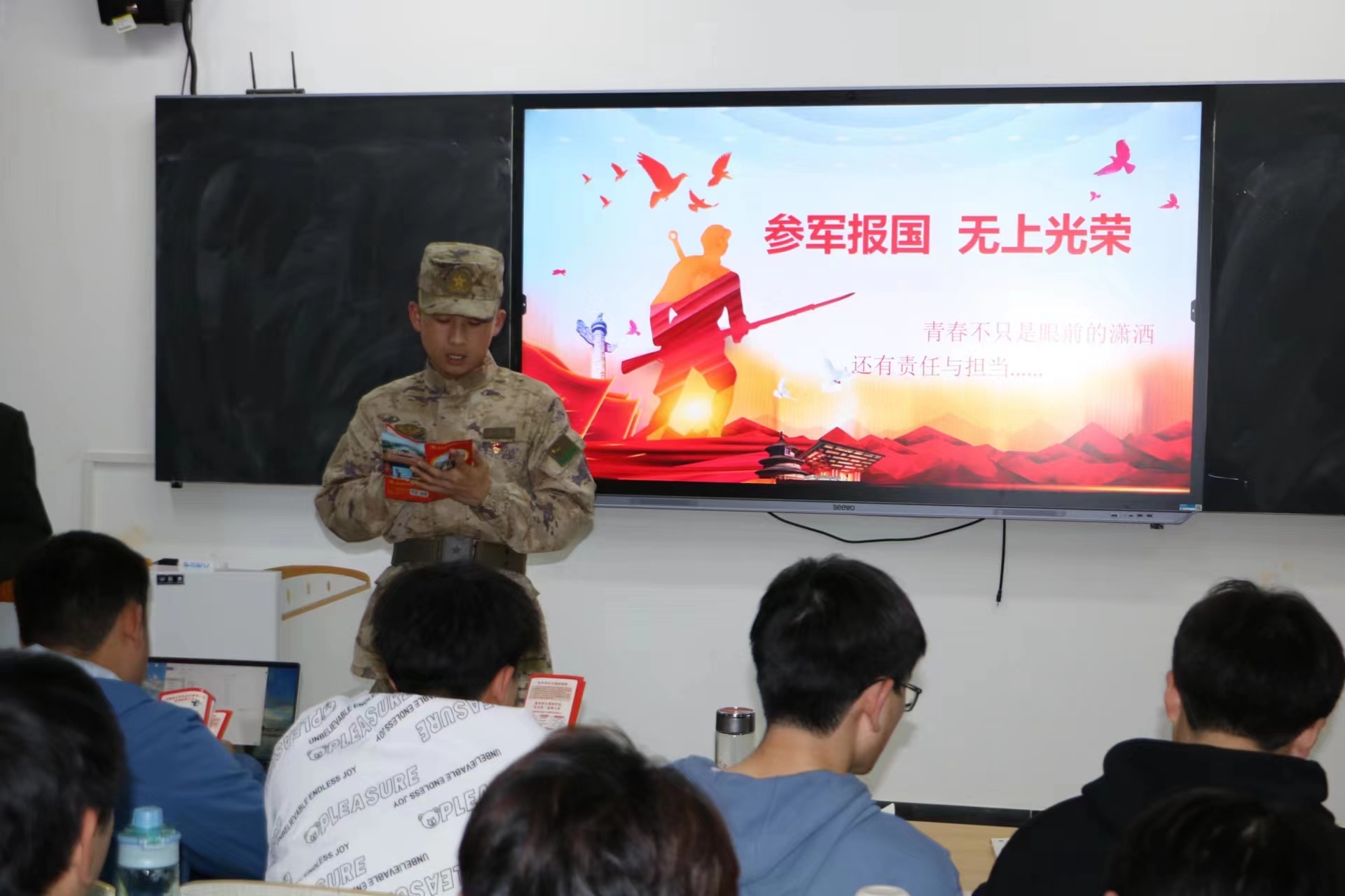 三位同学通过发放宣传单、现场讲解等方式,向适龄青年讲解最新的征兵政策法规,宣传应征入伍对大学生人生成长的帮助及保家卫国的重要性。他们向同学们重点介绍了大学生参军入伍的条件和流程,细致讲解了大学生参军入伍的各项优惠政策,包括入伍前、服役期间到期满安置,从各类补助补贴待遇到考学提干等,并对学费补偿、学籍保留、转专业及未来发展等热点问题进行了一一解答。同时,他们还分享了军旅生涯的经历、体会和收获,以鲜活而感人的亲身经历激发大学生们参军报国的热情。他们表示投身军营、参军入伍,是每个适龄公民应尽的责任和义务,并呼吁同学们珍惜机会、踊跃报名、投身军营,到部队中成长和锻炼自己,为国防事业贡献力量。