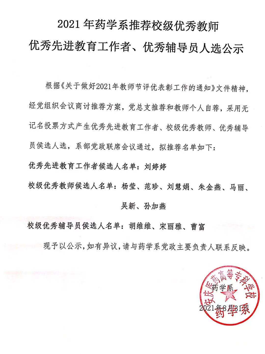 关于2021年药学系推荐安庆市优秀教师、优秀辅导员人选公示