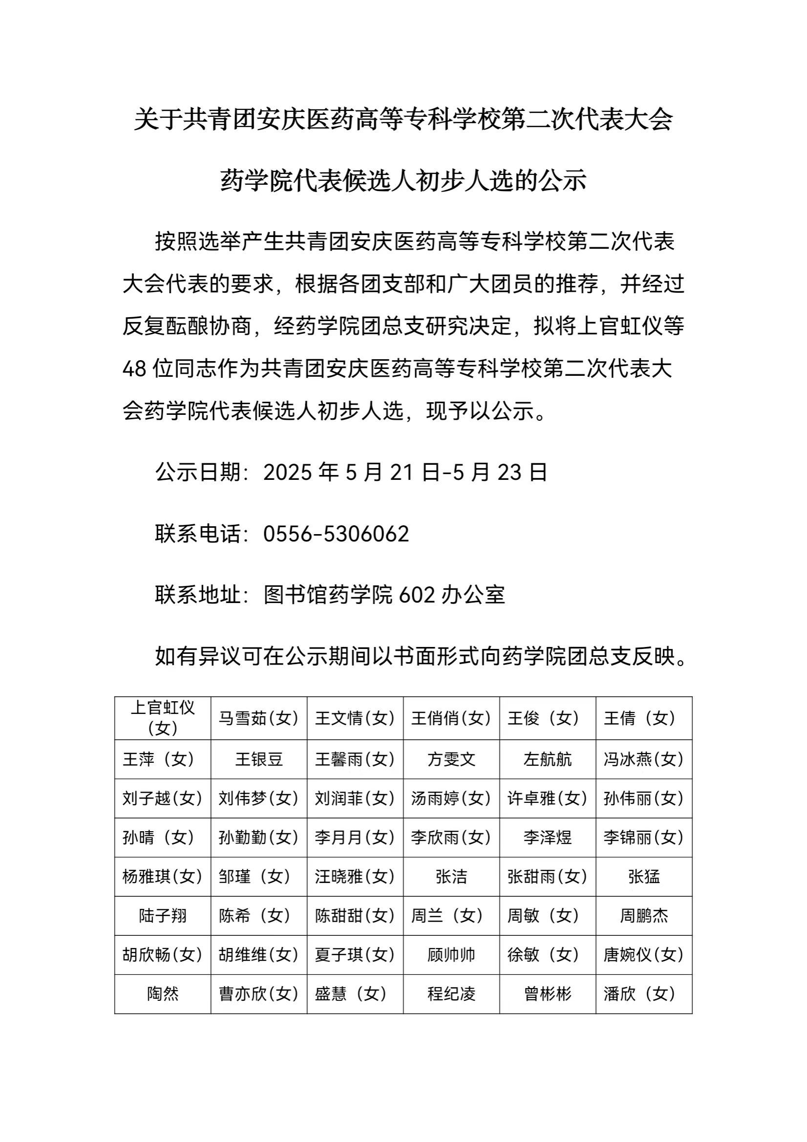 关于共青团安庆医药高等专科学校第二次代表大会药学院代表候选人初步人选的公示