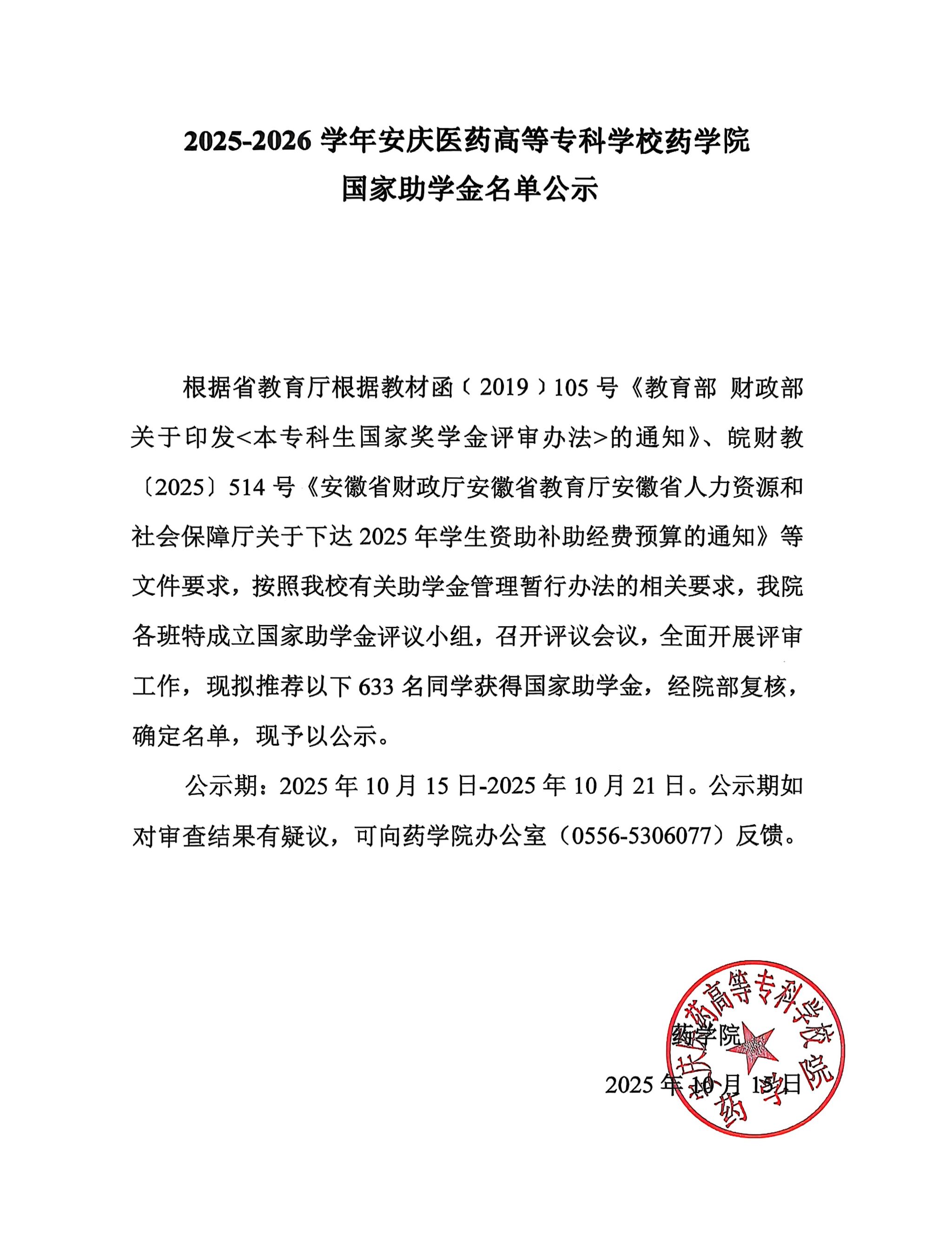 2025-2026学年安庆医药高等专科学校药学院国家助学金名单公示