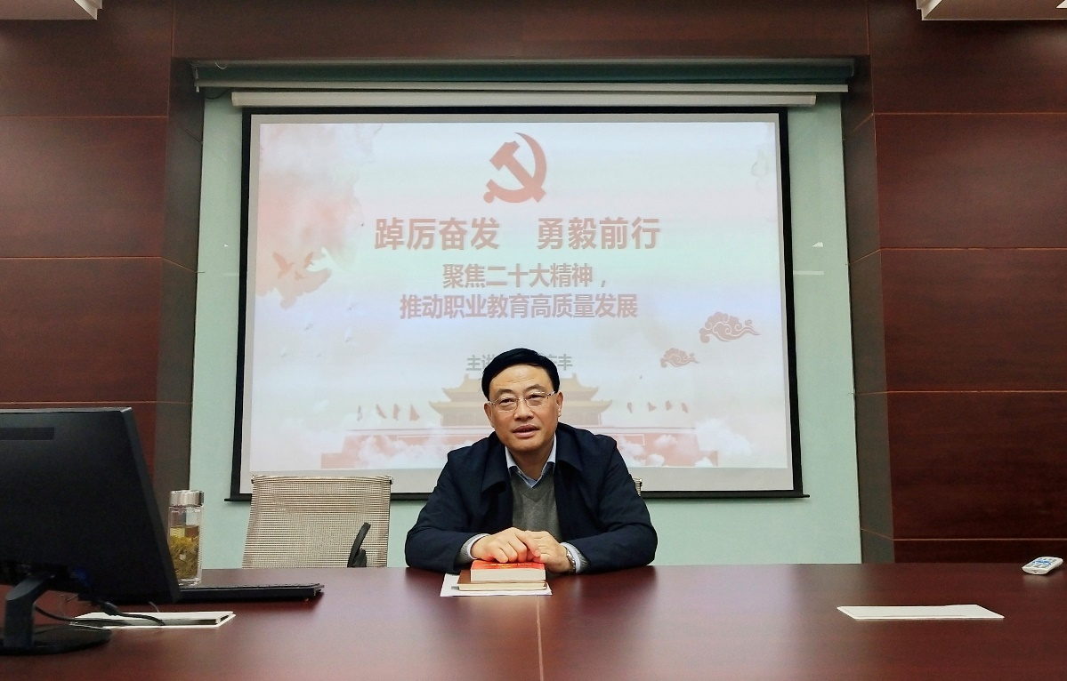 党的二十大鲜明提出“办好人民满意的教育” 的根本要求,明确二〇三五年建成教育强国的总目标。朱庆丰结合自己的学习感悟,围绕党的二十大召开情况、党的二十大报告中职业教育重要内容解读、习近平总书记关于职业教育历年讲话精神及踔厉奋发,勇毅前行的工作要求四个方面对党的二十大精神进行了全面阐释和深入解读。课上,朱庆丰还传达了省教育厅副厅长储常连到我校调研考察所作的报告精神。