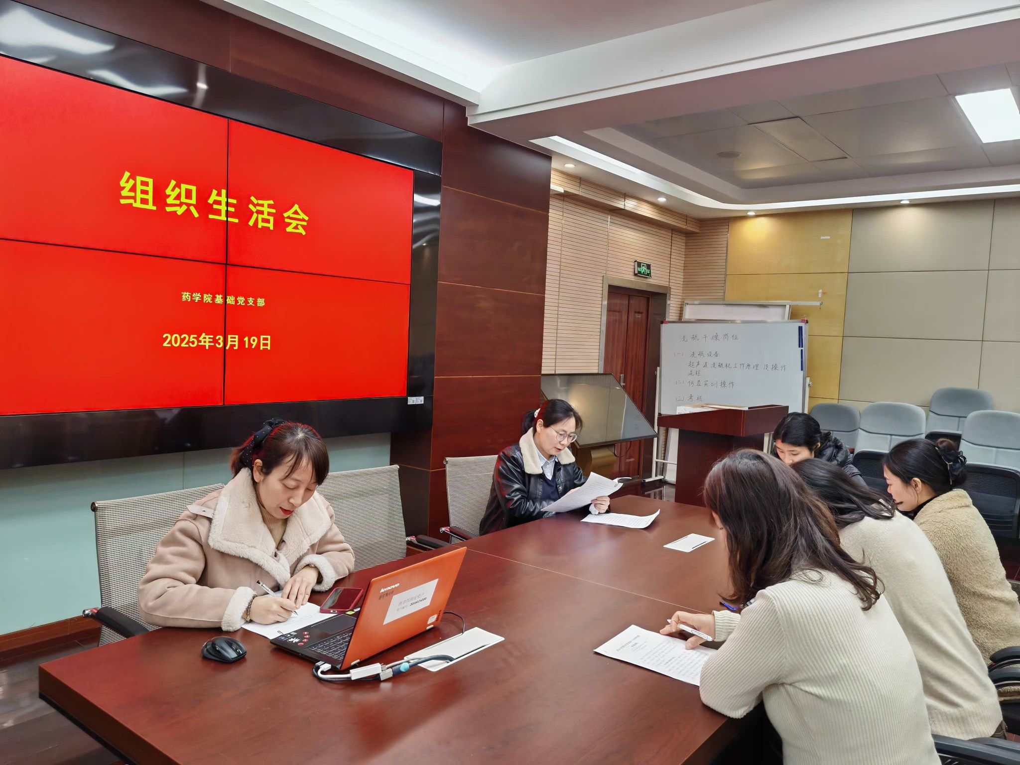 2025年3月19日,药学院基础党支部在图书馆1楼召开了2024年度组织生活会,药学院基础党支部全体党员参会,会议由党支部书记祝凌丽主持。此次会议旨在深入学习贯彻习近平新时代中国特色社会主义思想,加强党组织建设,提升党员的党性修养和凝聚力,为新一年工作开展奠定坚实基础。