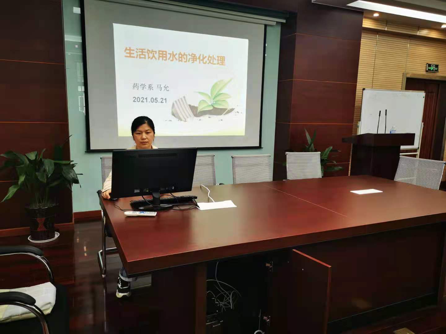 为了更好的将化学专业理论知识与实践相结合,2021年5月21日药学系分析化学教研室马允老师作了一场“生活饮用水的净化处理”专题讲座。